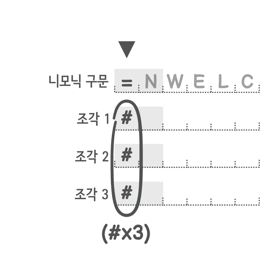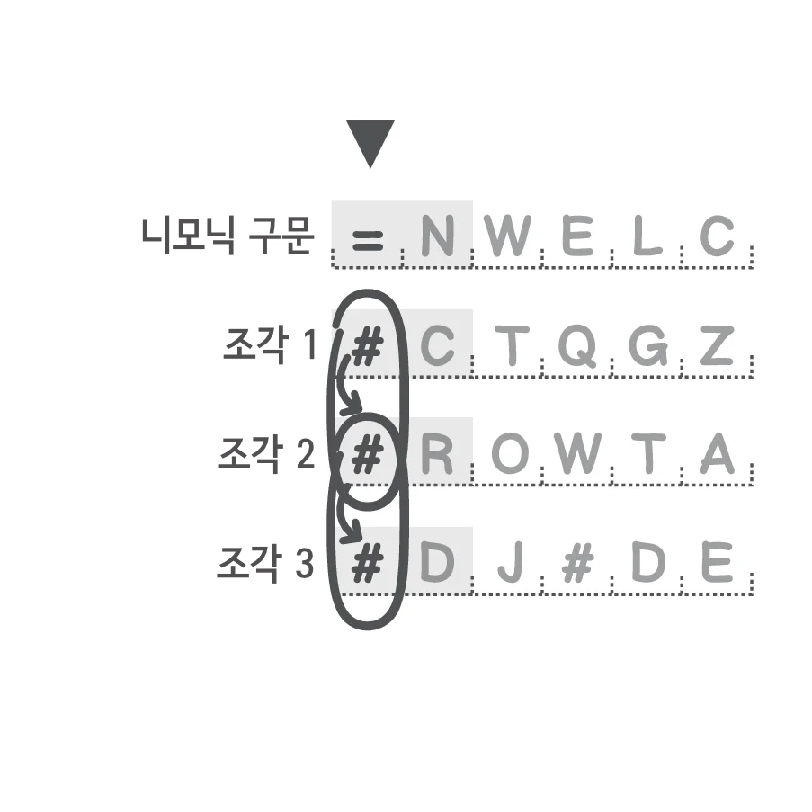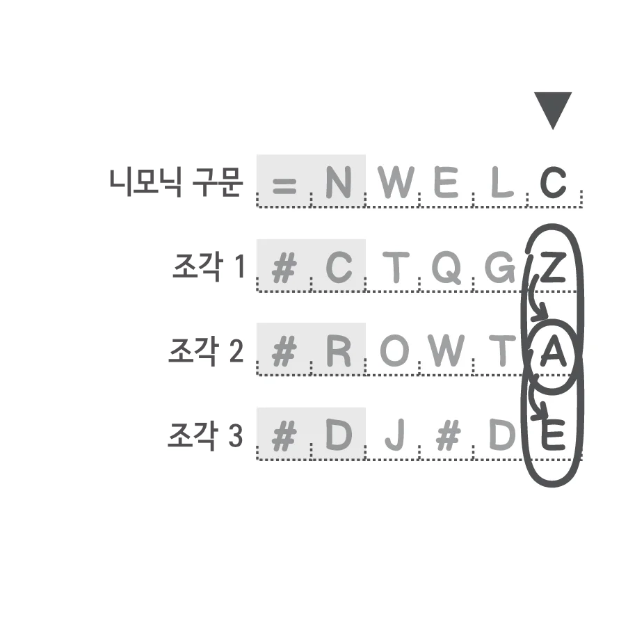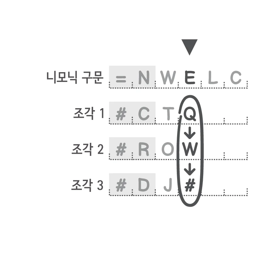 조각은 한 글자씩 순차적으로 생성합니다. 각 조각의 첫 글자는 니모닉 구문의 첫 글자에서 생성되며, 이후에도 동일합니다. 지금은 연필을 사용해 오류 발생 시 수정할 수 있게 합니다.